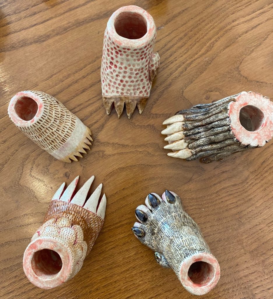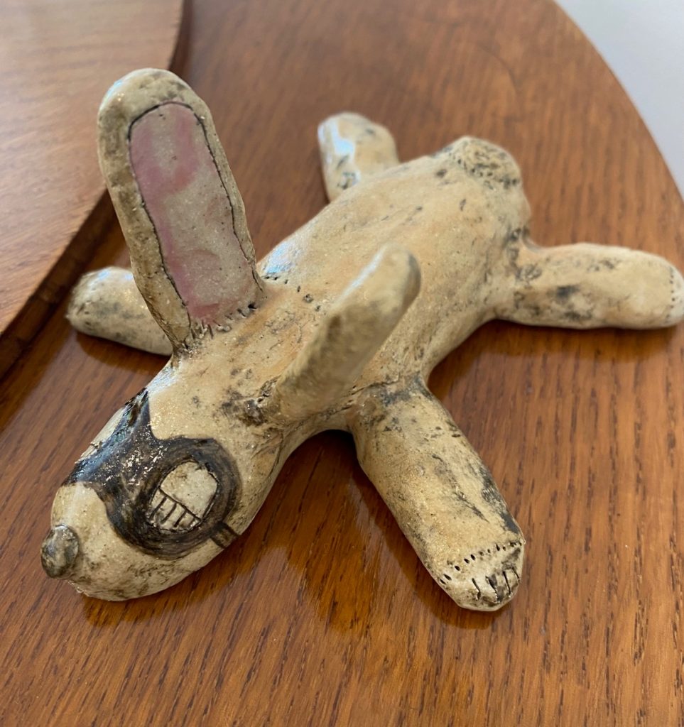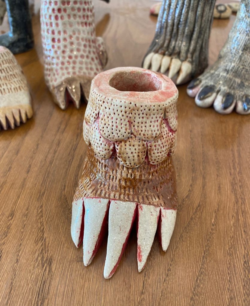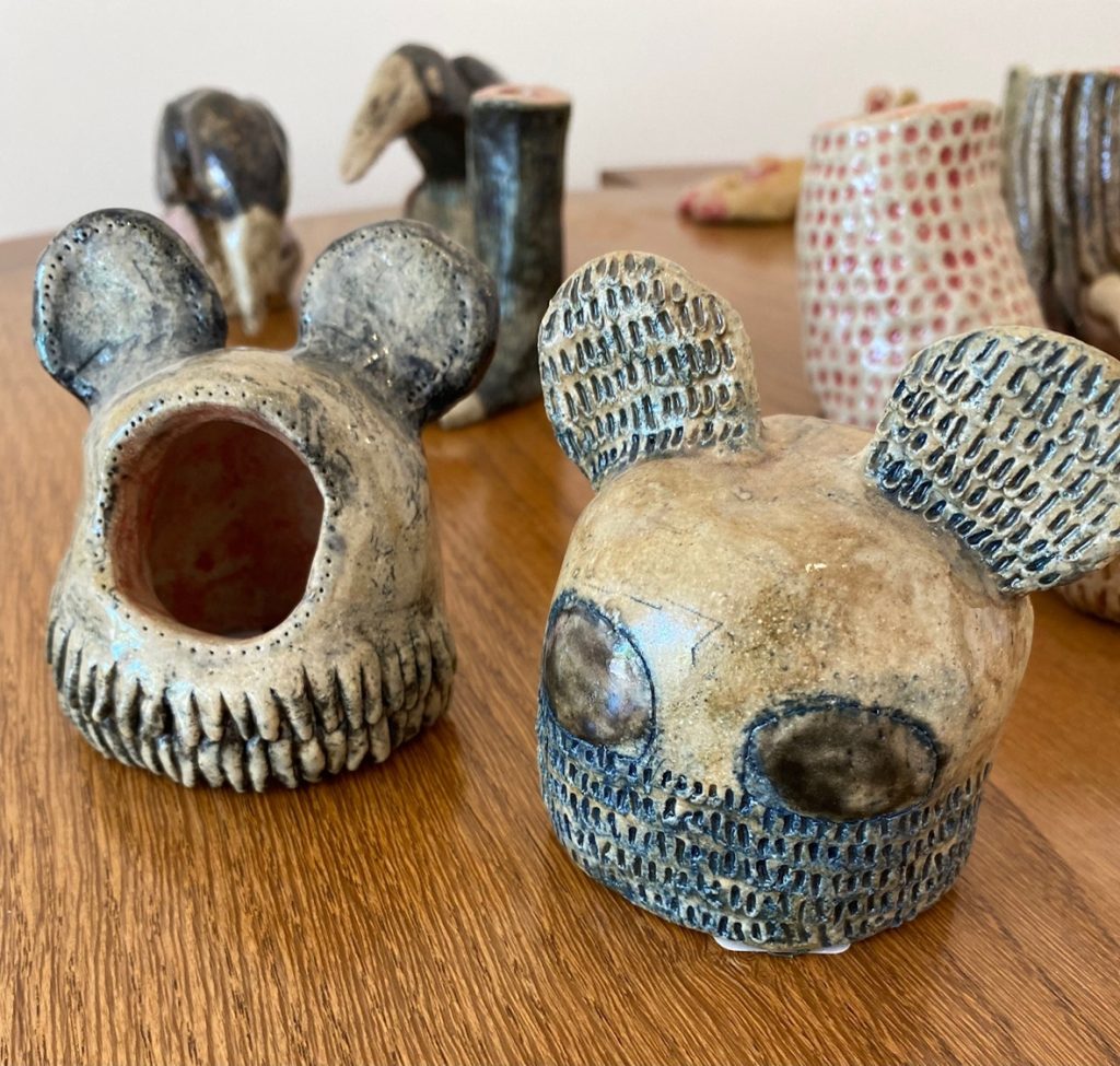 Le grès, travaillé, incisé et enrichi de reliefs, porte les traces du geste. Ces « cicatrices à caresser » invitent à une relation tactile à l’œuvre, où le toucher prolonge le regard. Souvent de petite taille, ses sculptures tiennent dans la main et instaurent une proximité intime. Traversé par une « mélancolie gaie », son travail évoque l’enfance comme une mémoire vivante plutôt qu’une nostalgie. Certaines pièces prennent la forme de talismans contemporains, entre fragilité et protection.