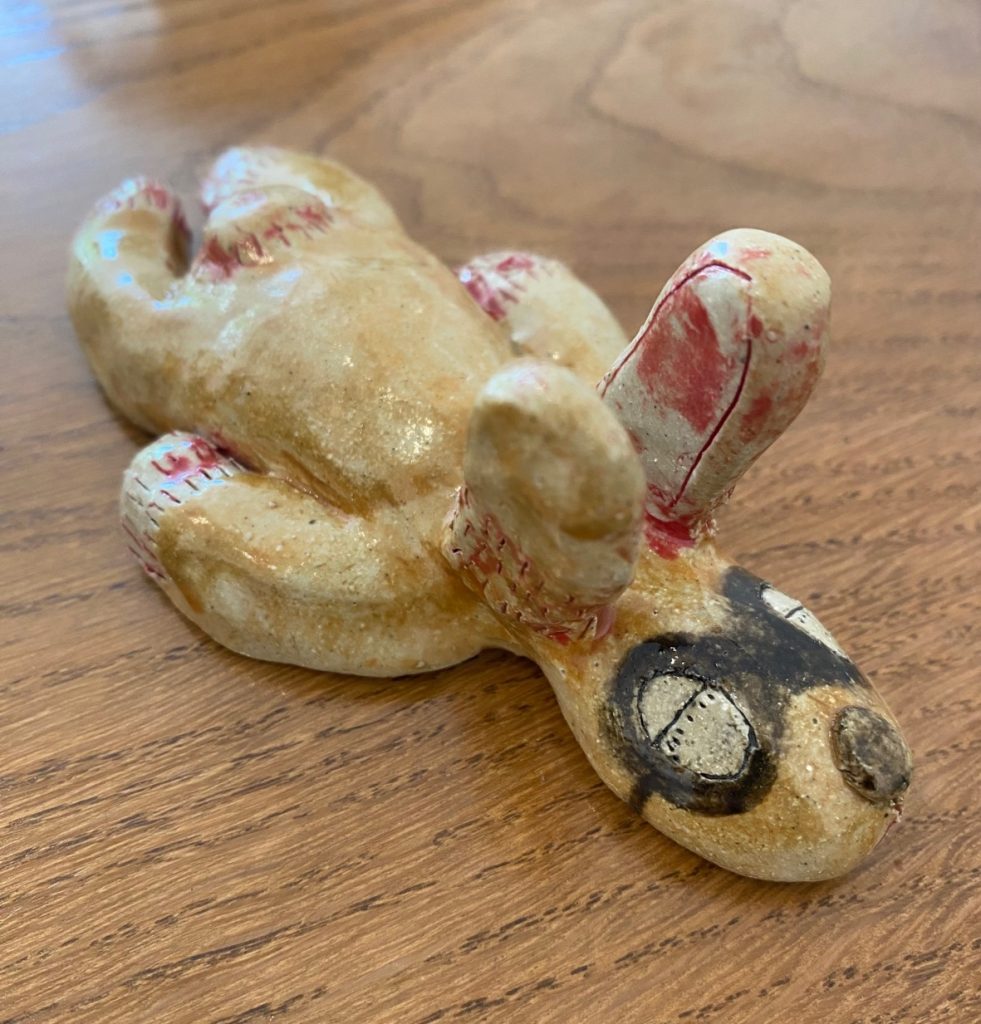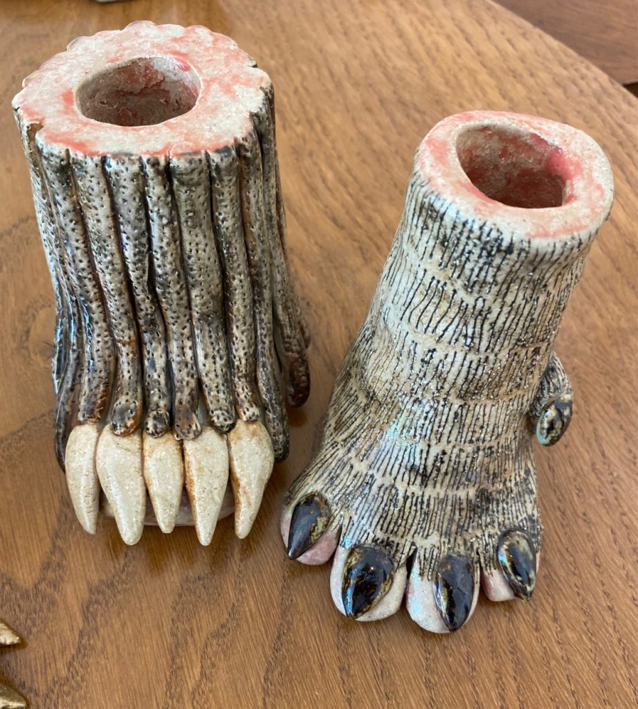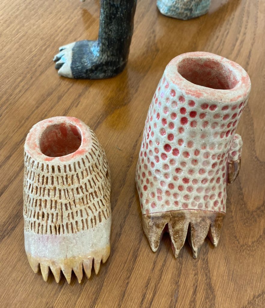 Le grès, travaillé, incisé et enrichi de reliefs, porte les traces du geste. Ces « cicatrices à caresser » invitent à une relation tactile à l’œuvre, où le toucher prolonge le regard. Souvent de petite taille, ses sculptures tiennent dans la main et instaurent une proximité intime. Traversé par une « mélancolie gaie », son travail évoque l’enfance comme une mémoire vivante plutôt qu’une nostalgie. Certaines pièces prennent la forme de talismans contemporains, entre fragilité et protection.