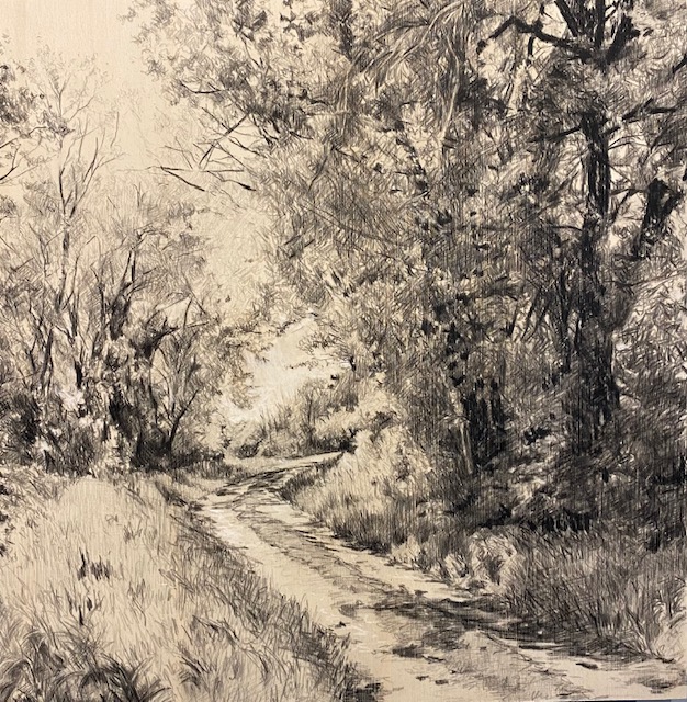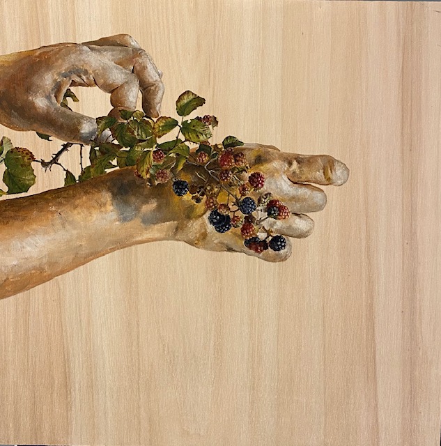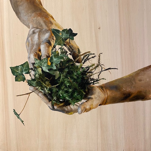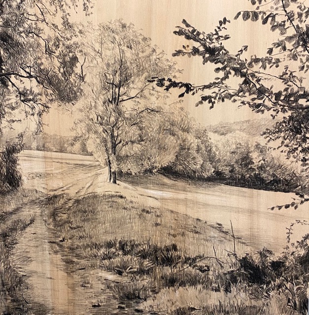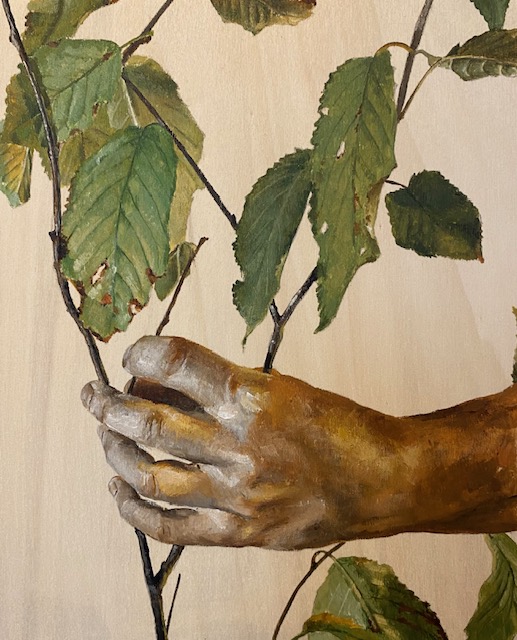 Des fragments du corps s’associent à des éléments végétaux — feuilles de chêne, d’églantier — tandis que des paysages, traités au graphite et à la pierre noire, dessinent les contours d’une possible réconciliation. Le support lui-même, le bois, participe de cette immersion, ancrant les œuvres dans une matérialité organique et sensible.