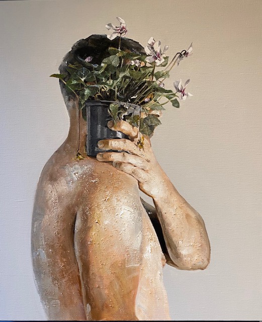 D’un geste spontané, le personnage enlace un large morceau de papier peint ancien. La beauté du geste laisse à penser à un attachement très fort à cet objet, qui, spontanément envahit la toile. Le corps disparaît au profit du motif floral et géométrique. Soulignées par une lumière bleutée, ces figures décoratives s’échappent parfois de leur support, se transformant ainsi, comme par magie, en tatouage ou en décor de l’œuvre.